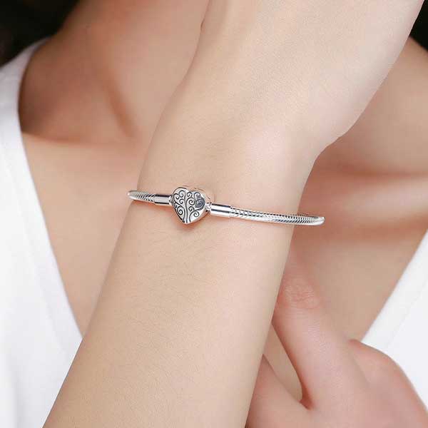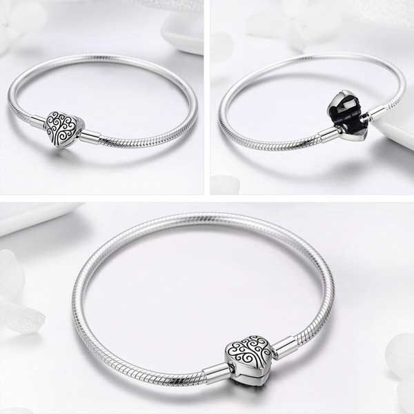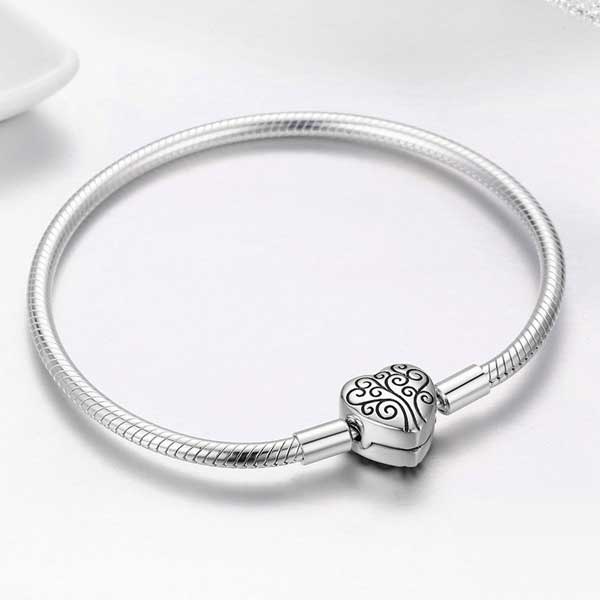 The classic Tree of Life Heart Clasp Bracelet is certified .925 sterling silver. Worn individually or stacked, silver bracelets are fashion staples that never go out of style. Transform the bracelet from daytime to evening wear by adding your favorite sparkling charms.
